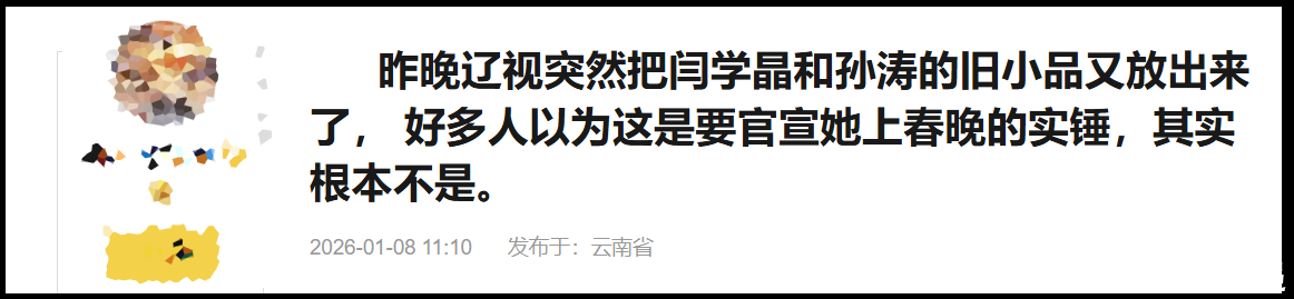 目前辽视春晚已进入录制阶段,据反馈已不见昔日老友亮相,并且还有网友发文,称在录制前几天,官方曾特意放出闫老师与孙涛的旧日作品,疑似测试舆论动向。