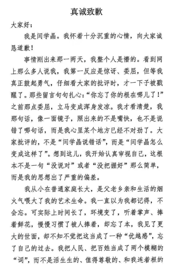 酸黄瓜风波发酵近半个月后,老艺术家闫学晶终于想起来道歉了。