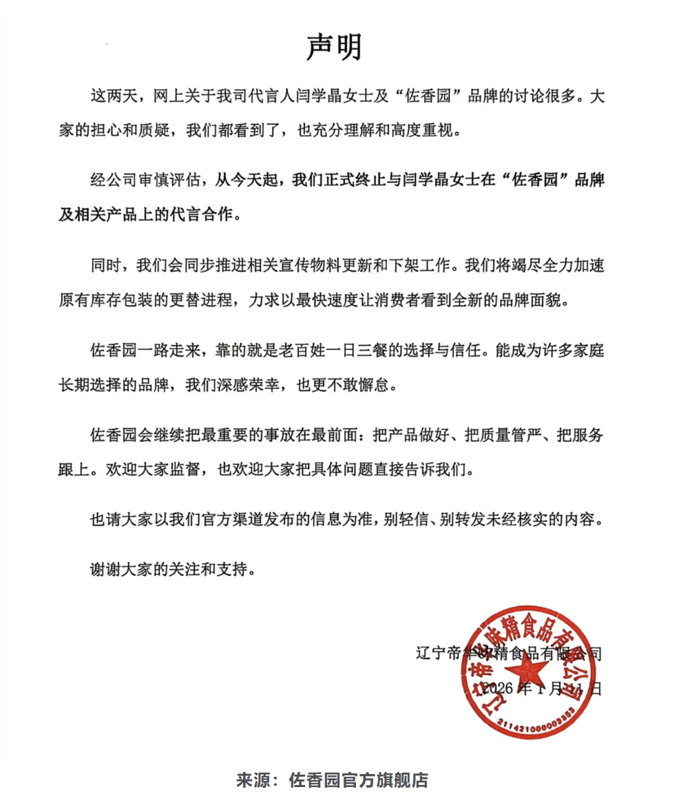 佐香园“遗憾”的宣布终止与闫学晶合作关系,后续会尽快更换包装。合作了十多年的统厨也在随后发声,称正和闫学晶团队协商解约问题,不仅要解约他还要考虑赔偿问题。